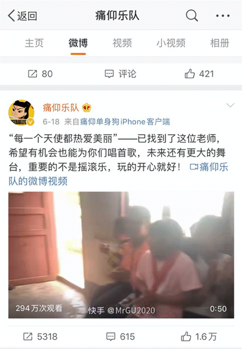 視頻發出后,#山村老師帶學生玩搖滾#登上微博熱搜,各家媒體紛紛跟蹤報道。歌曲原唱痛仰樂隊自己也關注到了這條視頻,“被觸動了,”樂隊的主唱高虎回憶當時的情景,他于是寫道:“希望有機會也能為你們唱首歌。”