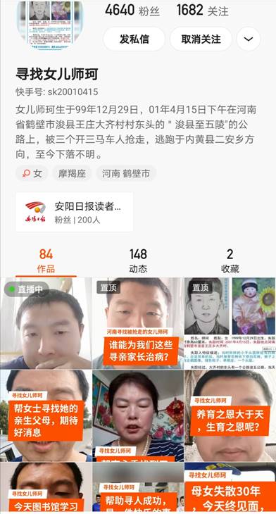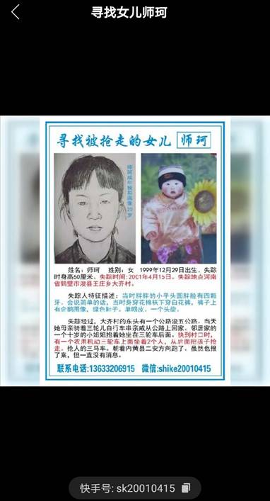 一棒接力手——“尋找女兒師珂”(快手號:sk20010415)