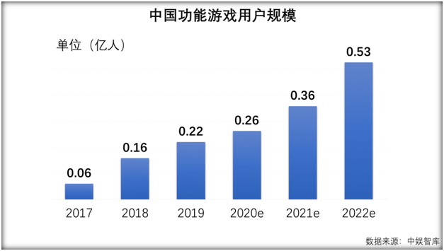 用戶規模:從功能游戲的用戶規模統計來看,雖然功能游戲受眾可能會存在局限性,但相對于全國游戲用戶超6億的規模,當前中國功能游戲的用戶規模仍顯低,這對于未來入局的優質功能游戲則更為友好,可享有更多用戶紅利,預計到2022年,用戶將達到0.56億。