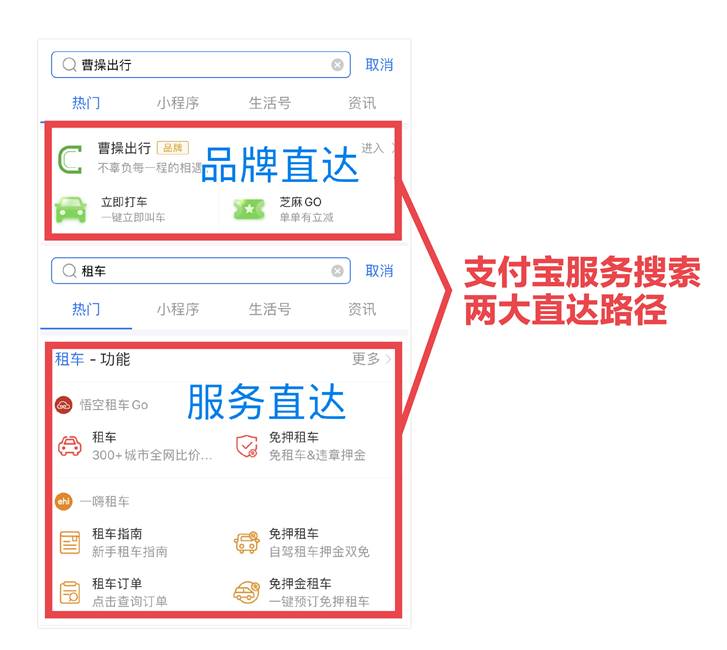 據(jù)了解,支付寶小程序數(shù)量已達(dá)200萬,月活超6億,搜索精準(zhǔn)匹配需求很有必要。2019年8月,支付寶小程序宣布開放“服務(wù)直達(dá)”,在支付寶搜“快遞”、“租車”等功能服務(wù)關(guān)鍵詞,可直接呈現(xiàn)具備相關(guān)功能的小程序。2019年9月,“品牌直達(dá)”上線。目前,基于用戶最常用的兩類搜索習(xí)慣,支付寶已經(jīng)形成了品牌和功能服務(wù)全覆蓋的服務(wù)搜索直達(dá)。