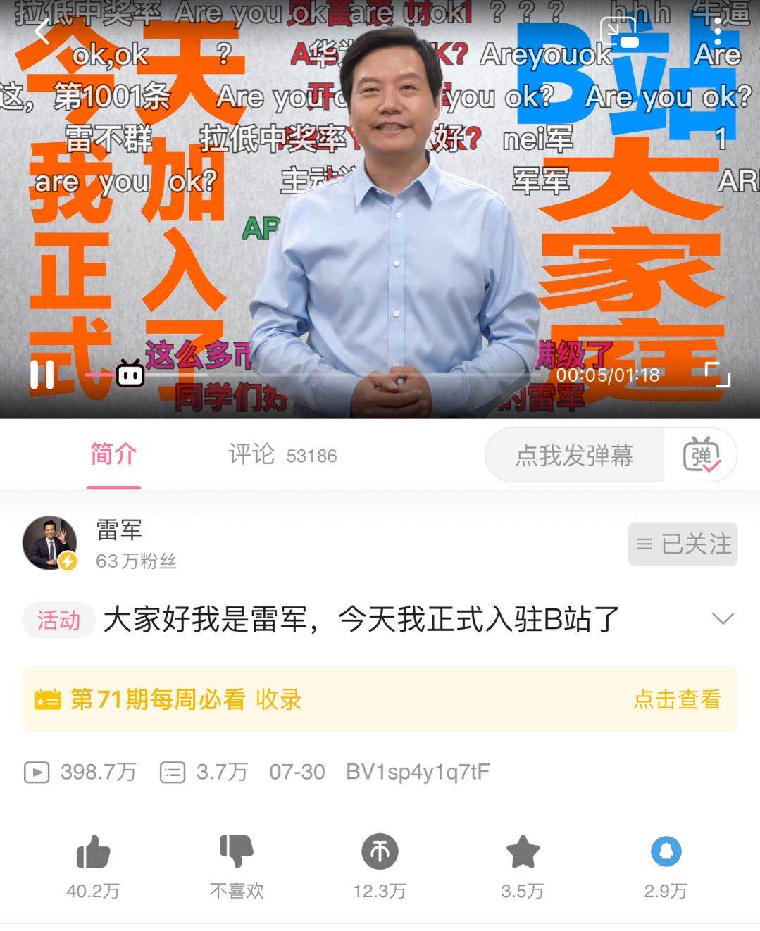 7月30日,雷軍正式宣布入駐B站,憑借著超高的話題度,不到一周的時間粉絲數(shù)已達63萬,首秀視頻播放量接近400萬,同時收獲了4.2萬的點贊。輸出形象的重要陣地。