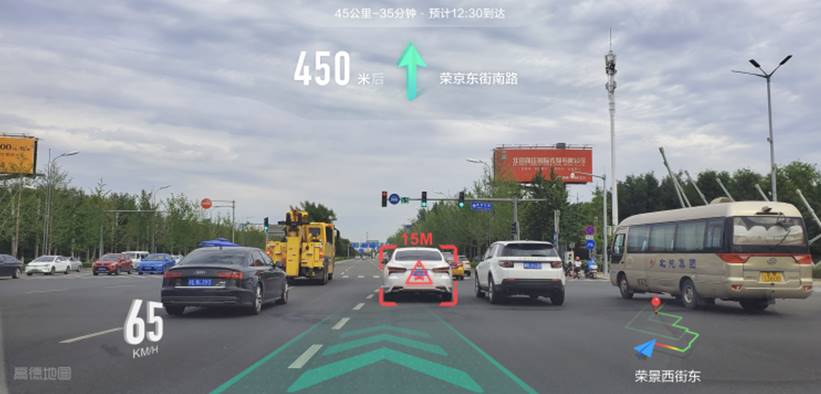 高德AR導航能夠對過往車輛、行人、車道線、紅綠燈位置以及顏色、限速牌等周邊環境進行智能的圖像識別,為駕駛員提供車距監測、碰撞預警、行人預警、車道偏離提醒、前車啟動提醒、紅綠燈提醒等一系列駕駛安全輔助功能,帶來比傳統地圖導航更加精細、更加安全的服務體驗。