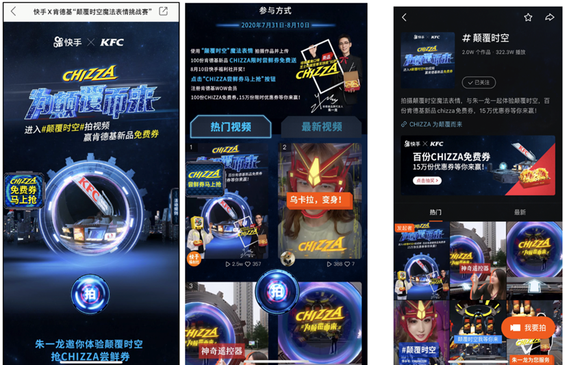 近日,快手與肯德基進行了線上營銷合作,針對肯德基推出的新品“CHIZZA”,快手為其定制了一款VR魔法表情和線上挑戰賽,用戶在快手拍攝視頻前,搜索“顛覆時空”即可體驗使用。