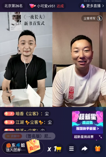 直播最后,尼格買提還與快手讀書達人“塵客將軍”(快手ID:103332)連麥,暢聊“為什么書名叫《一夜長大》”“有沒有印象深刻的成長瞬間”等話題。