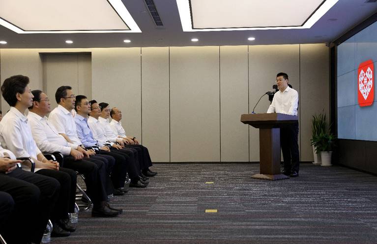 ▲8月21日,上海市委書記李強(左二),貴州省委書記孫志剛(左三),貴州省委副書記、省長諶貽琴(左一)等滬黔主要領導赴拼多多考察。拼多多CEO陳磊就公司發展作相關匯報。(安舜 攝)