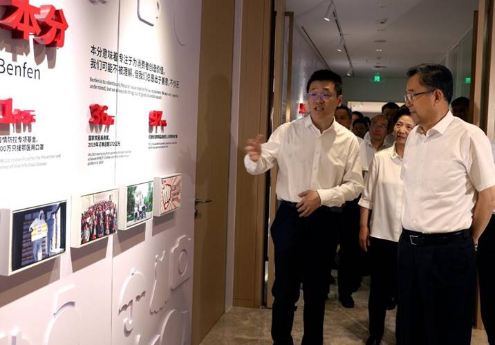 ▲8月21日,貴州省委書記孫志剛(右一),貴州省委副書記、省長諶貽琴(右二)等滬黔主要領導赴拼多多考察,調研了解貴州農產品上行情況。拼多多CEO陳磊(左一)介紹了公司的發展歷程和最新進展。(安舜攝)