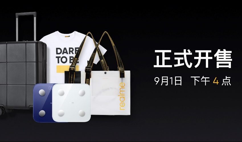 ?此次發(fā)布會上,realme帶來了五款潮玩新品:體脂秤、托特包、旅行箱、及紀念版T恤衫。