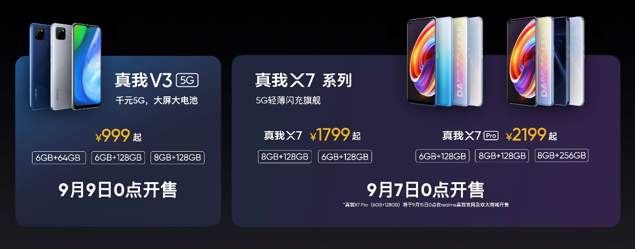 真我X7系列及真我V3各版本和首發(fā)價分別為,真我X7為8GB+128GB和6GB+126GB兩個版本,起售價為1799元,真我X7 Pro為6GB+128GB,8GB+128GB和8GB+256GB三個版本,起售價為2199元;真我V3為6GB+64GB,6GB+128GB和8GB+128GB三個版本,起售價為999元。