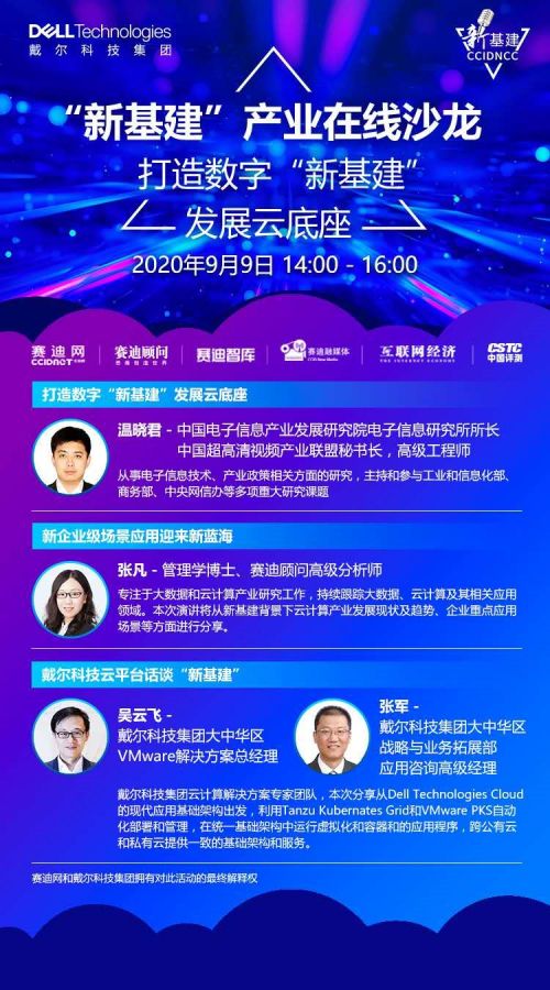 為了更好的幫助民眾、各企業更好的理解“新基建”發展趨勢,幫助更多企業抓住“新基建”風口發展。由賽迪研究院與戴爾科技集團聯合主辦的“新基建在線沙龍·第七期”將于9月9日(周三),在“打造數字‘新基建’發展云底座”的主題下,圍繞新基建背景下云計算如何賦能數字經濟建設展開討論。活動現場將邀請多名行業知名專家與戴爾公司云計算領域負責人共同為大家解答新基建與云計算領域的諸多熱門話題。