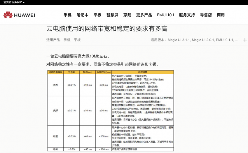 作為基于云端的服務,“云手機”對于終端的聯網狀態也有極高的要求。雖然速途網并未在華為云官網找到對于網絡的要求,但從目前已經在華為手機中已實裝的、類似于云手機的“云電腦”服務對于網絡的要求來看,一臺云電腦需要10Mbps帶寬,小于0.01%的丟包率、雙向時延小于30毫秒。