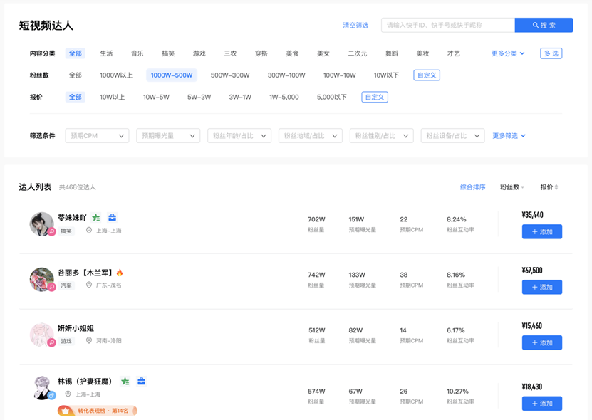 基于多元和智能的大數(shù)據(jù),在達(dá)人篩選上,快接單對(duì)達(dá)人廣場進(jìn)行全面改版、對(duì)達(dá)人主頁進(jìn)行升級(jí)迭代,幫助廣告主高效匹配達(dá)人,助力投放效果最大化與營銷效果最優(yōu)化。新版達(dá)人廣場包含視頻達(dá)人廣場與直播達(dá)人廣場,在粉絲量、內(nèi)容類型與報(bào)價(jià)等基礎(chǔ)篩選維度之外,新增多種達(dá)人篩選的維度。新增達(dá)人列表基礎(chǔ)數(shù)據(jù)與“已選達(dá)人”功能,廣告主在選擇達(dá)人后,可在選擇列表內(nèi)長期保留,并對(duì)意向達(dá)人進(jìn)行數(shù)據(jù)對(duì)比和優(yōu)選。同時(shí),新版達(dá)人主頁將視頻主頁與直播主頁拆開,最大程度開放達(dá)人視頻及直播數(shù)據(jù),新增更多達(dá)人基礎(chǔ)信息,是否對(duì)公結(jié)算、是否為機(jī)構(gòu)下達(dá)人等信息一目了然。