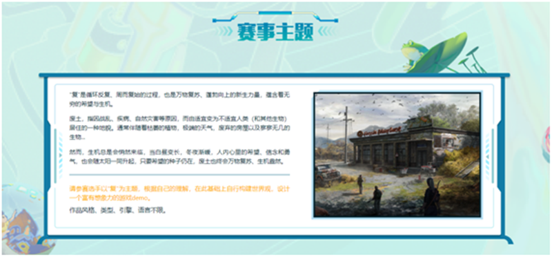 不同于往屆賽事的命題風格,今年大賽命題別出心裁,以“廢土”為引,以“復”為名,希望借此為2020年帶來萬物復蘇、蓬勃向上的新生力量。在初賽階段,參賽選手需根據自己的理解,以復為主題設計一個富有想象力的有趣游戲,但游戲類型、風格、語言、引擎等在比賽中將均不設限,期待參賽者們可以大放異彩,盡情釋放自己的游戲創作才華。