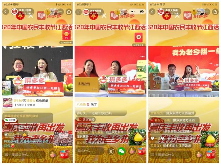 今年以來,拼多多“市縣長直播”“新農人電商培訓”活動也多次走進江西南昌、贛州、上饒等多個地市,積極助力當地農民脫貧攻堅,致富增收。其中,江西省各市縣政府領導也對“直播助農活動”給予了大力支持,雙方累計合作超過35場。