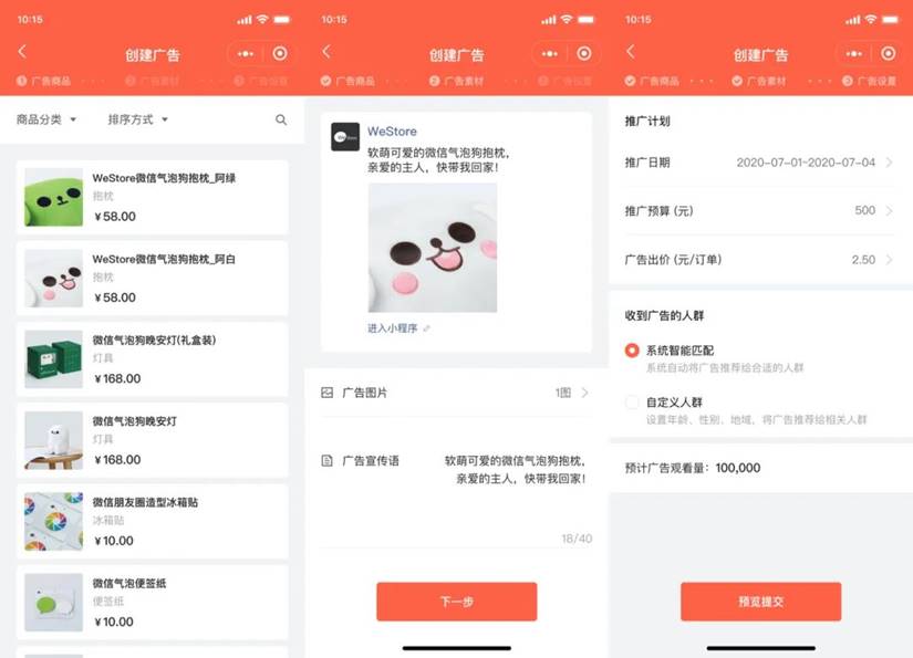 目前“小商店推廣”已在企業(yè)和個人店灰度上線,后續(xù)將陸續(xù)放開。個人店可通過移動端管理后臺“廣告投放”進(jìn)入“小商店推廣“,企業(yè)店則通過電腦端后臺掃碼進(jìn)入小程序。投放流程也十分簡單,只需選擇一個商品后編輯好廣告圖文并設(shè)置廣告后,即可進(jìn)行推廣。系統(tǒng)將基于騰訊商品大數(shù)據(jù),精準(zhǔn)投放目標(biāo)客群,商家也可實(shí)時查看投放效果。
