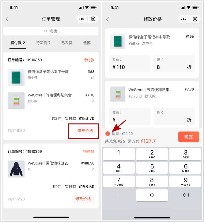 此外,小商店的基礎(chǔ)功能也迎來進(jìn)一步優(yōu)化:支持商家在移動端直接修改待付款訂單的價格(目前僅支持調(diào)低價格),提供靈活的優(yōu)惠價格和運(yùn)費(fèi)減免服務(wù);同時,當(dāng)消費(fèi)者下單或發(fā)起售后時,商家也可通過移動端的客服功能主動聯(lián)系消費(fèi)者,促進(jìn)交易轉(zhuǎn)化、提高溝通效率。