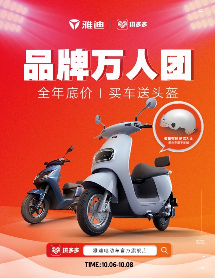 據悉,拼多多雅迪“品牌萬人團”活動將一直持續至10月8日,其間雙方將維持雅迪電動車全系產品的補貼力度,不斷補充特惠車型的庫存,持續滿足消費者智能、安全、便捷的出行需求。