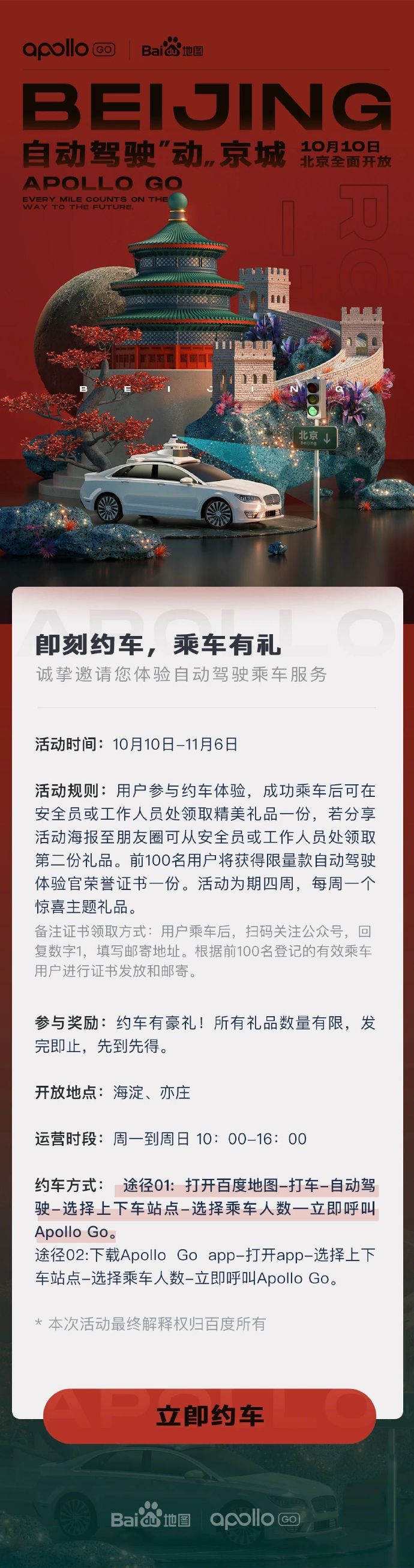 根據百度官微的內容,活動時間為10月10日至11月6日,用戶參與約車體驗,成功乘車后還有禮品贈送。約車方式有兩個,一是打開百度地圖-打車-自動駕駛-選擇上下車站點,二是下載Apollo Goapp乘車。