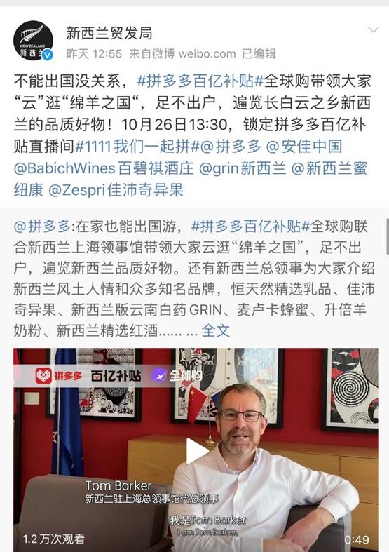 10月26日,拼多多“百億補貼”直播間走進新西蘭駐上海總領事館,與恒天然、佳沛、Grin、蜜紐康等十余個新西蘭國際知名品牌聯合開啟了一場云端溯源之旅。新西蘭駐上海代總領事馬克文也做客直播間,親自為家鄉產品代言打call,為7億拼多多用戶展示原汁原味的新西蘭風情。