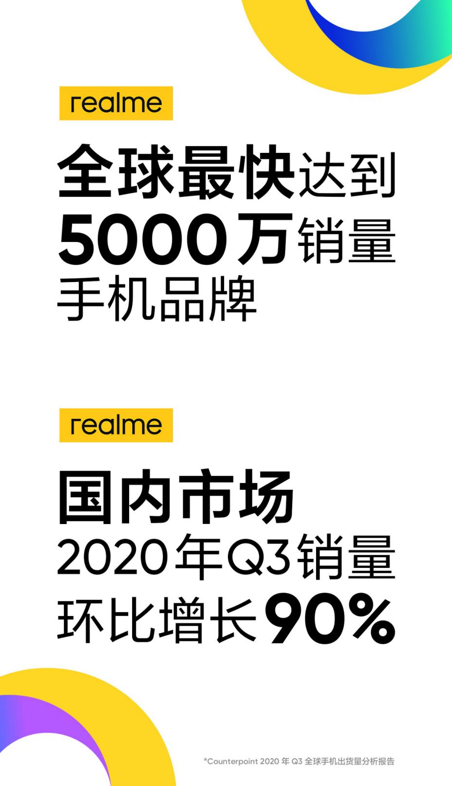 速途網(wǎng)10月30日訊(報道:喬志斌)今日,市場研究機構(gòu)Counterpoint發(fā)布的2020年第三季度全球智能手機出貨量統(tǒng)計數(shù)據(jù)顯示,realme的全球智能手機銷量突破5000萬臺,僅用了9個季度(2018 Q3-2020 Q3),成為全球最快達到該里程碑銷量的手機品牌。realme 2020年第三季度出貨量為1480萬臺,創(chuàng)歷史新高,realme也連續(xù)4個季度全球增長最快,穩(wěn)居全球第七。同時,國內(nèi)市場第三季度表現(xiàn)出強勁的增長勢頭,銷量環(huán)比增長90%。