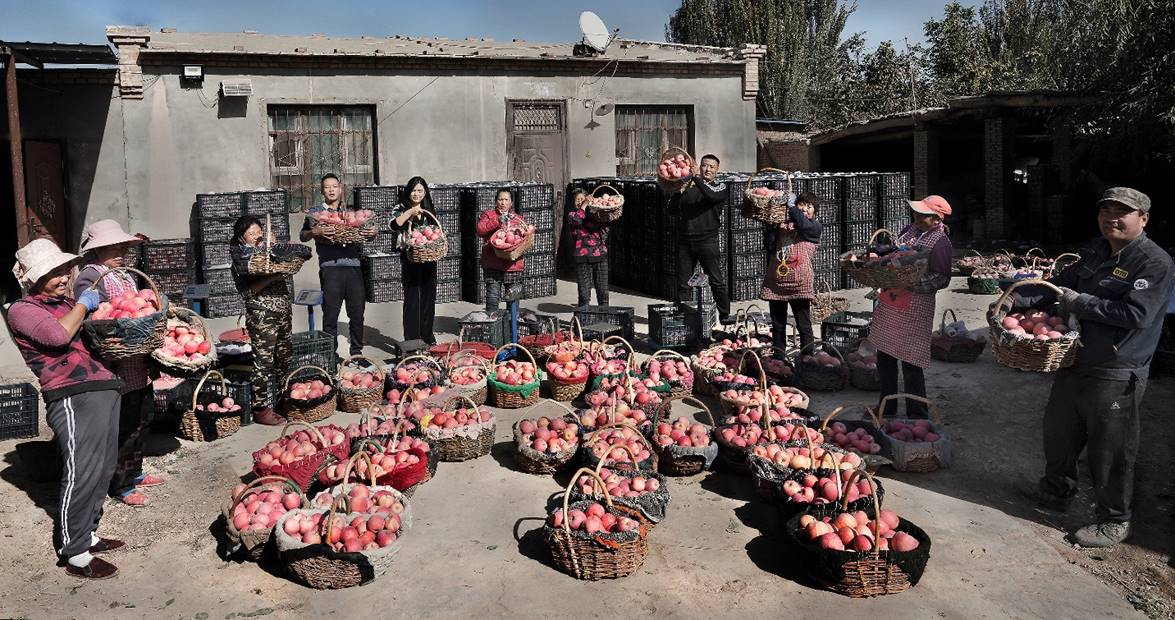 ▲2020年10月,阿克蘇蘋果采摘的季節里的普通一天,果農楊素芹家的小院成了拼多多產地直銷的貨倉,來幫工的鄰居們一天就能打包發三四噸貨。(穆功/攝)