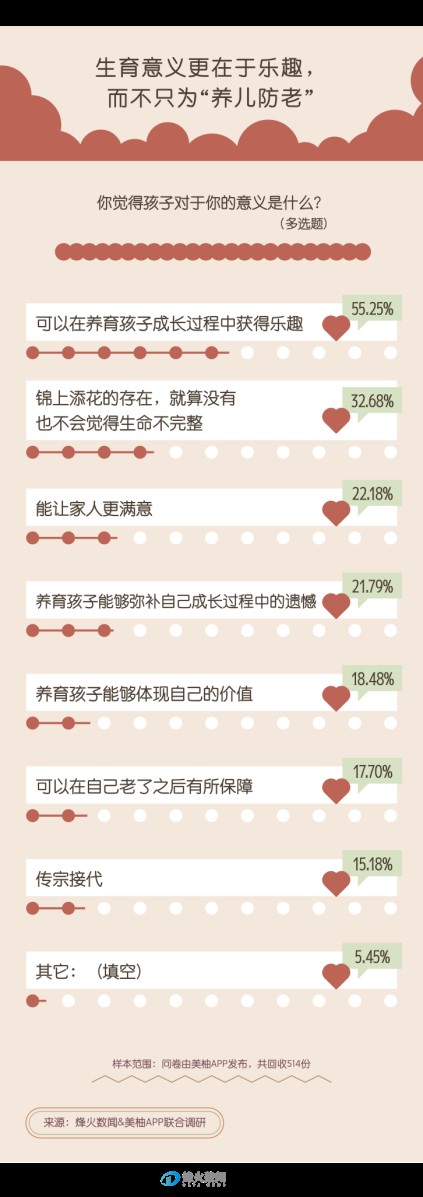 11月19日消息(報道: 王璇)近日,美柚聯合融媒體數據資訊平臺烽火數聞,發布了一則調研報告。調研顯示,“在養育過程中獲得樂趣”成為過半用戶的選擇,而諸如“傳宗接代”、“老有所養”、“無后有三、不孝為大”等傳統觀念下的生育理由已不再是最重要的。