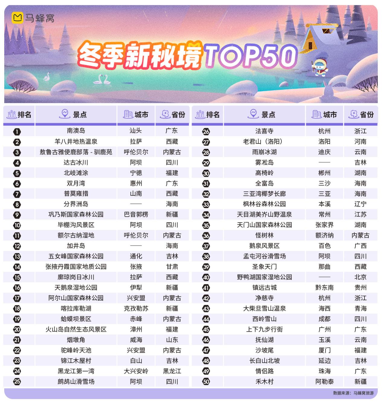 速途網11月27日消息(報道:李楠)今日,馬蜂窩旅游推出“冬季新秘境2020”的榜單,該榜單基于旅游大數據,結合用戶原創內容選出了50個適合冬季出游的國內景區景點,為中國游客的冬季旅游提供參考。