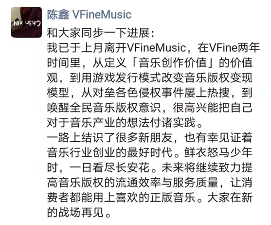 12月7日,原VFineMusic副總裁陳鑫在朋友圈表示,其已離開VFineMusic,開始在音樂領域創業。