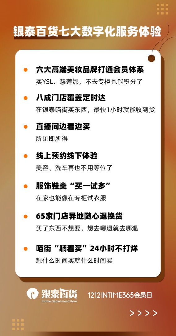 速涂網(wǎng)12月10日訊(報(bào)道:?jiǎn)讨颈螅┙衲觌p12,銀泰百貨會(huì)員服務(wù)體系全面升級(jí),加碼數(shù)字化服務(wù)體驗(yàn),值得一提的是,與蘭蔻、YSL、赫蓮娜、植村秀等六大高端化妝品品牌實(shí)現(xiàn)會(huì)員體系打通。這也意味著,未來,需要通過積分兌換的高端美容房服務(wù)在銀泰商場(chǎng)內(nèi)再無需到柜“手動(dòng)”積分,未來甚至或可“一鍵”兌換。銀泰也因此成為全國(guó)首個(gè)與品牌打通會(huì)員體系的百貨商場(chǎng)。