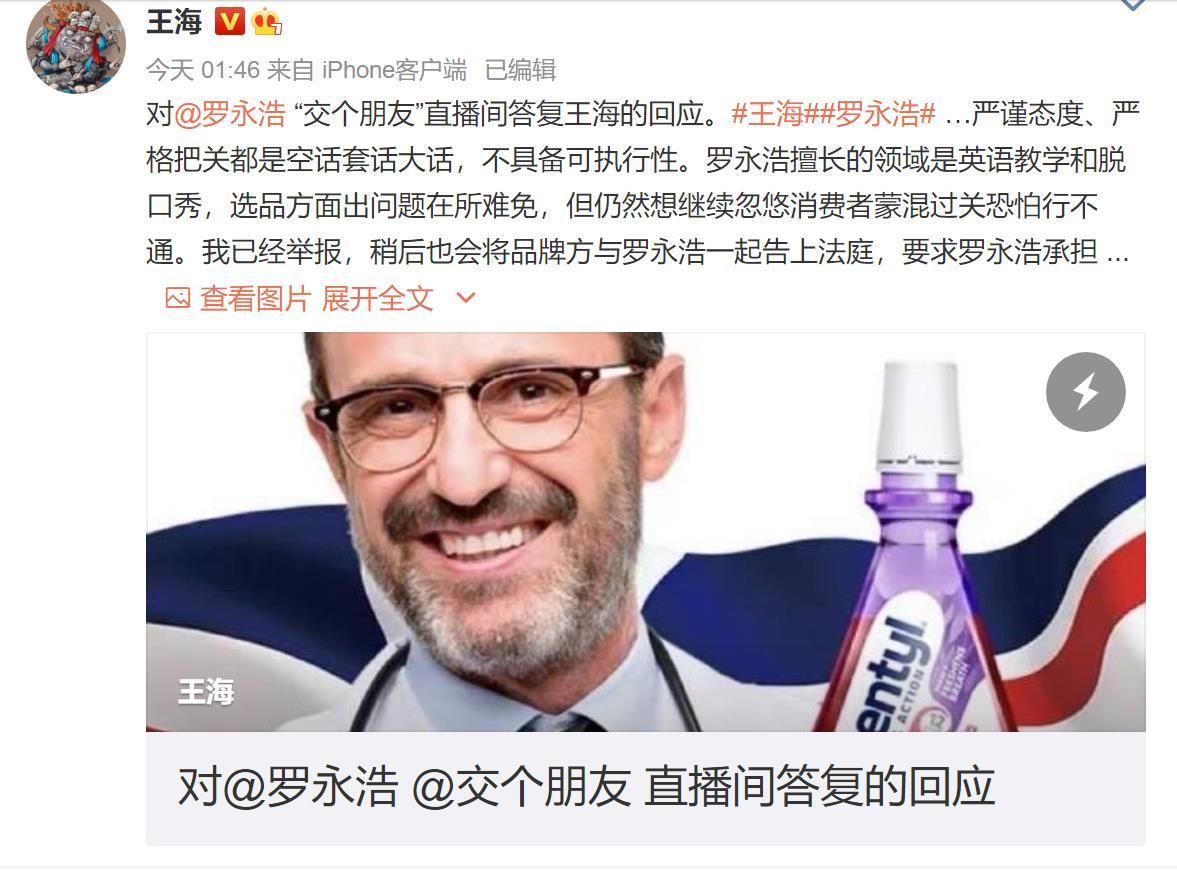 速途網(wǎng)12月15日訊(報道:王璇)今日凌晨, 打假人王海發(fā)文再度回應(yīng)羅永浩“帶貨漱口水涉嫌虛假宣傳”一事。王海在長文中一一回應(yīng)了此前羅永浩和交個朋友公司針對王海質(zhì)疑的回應(yīng)聲明,并強調(diào)羅永浩方面這份聲明并不成立,羅永浩依然要對產(chǎn)品涉嫌虛假宣傳負責。