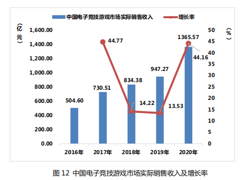 2020年,中國電子競技游戲市場實際銷售收入 1365.57億元, 比 2019 年增加了 418.3 億元,同比增長 44.16%。
