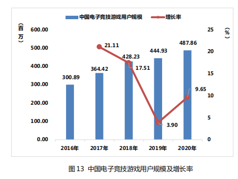 2020 年,中國電子競技游戲用戶規模達 4.88 億人,同比增長 9.65%,用戶數量保持穩定增長。