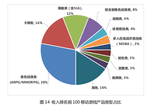 2020 年,在中國移動游戲收入排名前 100 的產品中,游戲類 型逐漸豐富,用戶選擇比較多,目前有三類游戲占比超過 10%,分 別是:角色扮演類游戲,占比為 28%;卡牌類游戲,占比為 16%; 策略類游戲,占比為 12%。