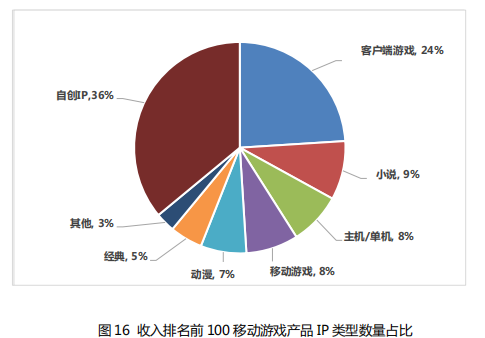2020 年,在收入前 100 移動游戲產品 IP 類型數量占比中,數 量占比最多的是自創 IP,占比為 36%。另有 24%、9%和 8%的移動游 戲分別由客戶端游戲、小說和主機/單機游戲改編而來。