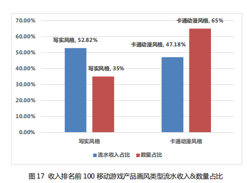 2020 年,在中國移動游戲收入排名前 100 的產品中,寫實風 格的產品數量占比雖然略低,但是收入比例較高。