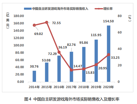 2020 年,中國自主研發游戲海外市場實際銷售收入達 154.50 億美元,比 2019 年增加了 38.55 億美元,同比增長 33.25%,繼續 保持高速增長態勢。