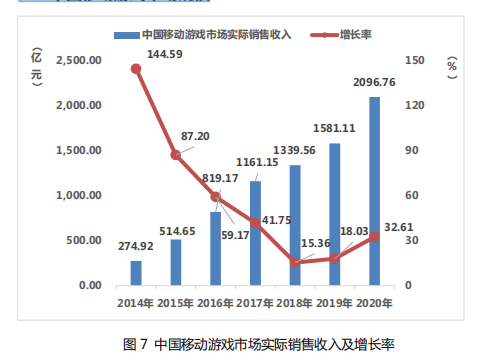 2020 年,中國移動游戲市場實際銷售收入 2096.76 億元,比 2019 年增加了 515.65 億元,同比增長 32.61%。