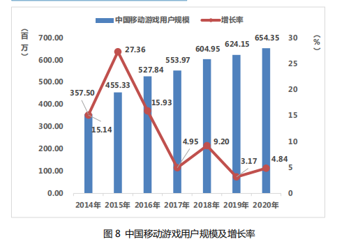 2020年,中國移動游戲用戶規模達6.54億人,同比增長4.84%。