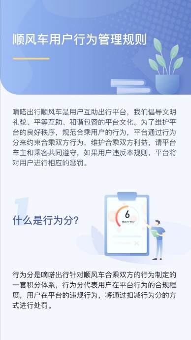 互諒,即要求合乘雙方應多從對方角度考慮問題,更多包容和理解;守信,即要求合乘雙方應守時履約,并對自己的行為負責;聲明,即要求車主和乘客有個性化需求或其他特殊情況時,應在合乘之前告知對方;本人,即要求本人合乘,禁止“代人叫車”和“物品托運”。
