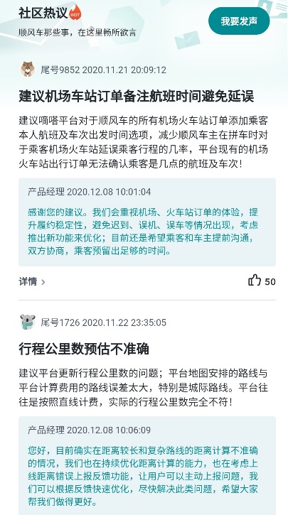 而社區熱議則是一個讓用戶充分自主發聲的平臺,用戶可以在這里寫下有關實際合乘場景中的體驗待優化之處,以及對于順風車產品任何意見和建議,包括問詢,嘀嗒平臺產品經理都會一一反饋。