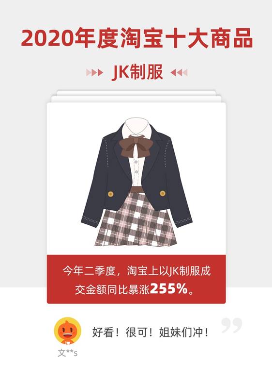 作為小眾創(chuàng)意商品最活躍的平臺(tái),繼漢服、lo裙在淘寶爆紅后,JK制服成功躋身今年淘寶最熱門(mén)單品之一。JK制服的評(píng)論區(qū)里,最多的一個(gè)字就是“沖”,“三坑少女”們面對(duì)喜歡的商品,話不多說(shuō)直接“沖”。