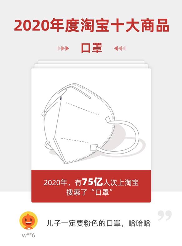 如果說(shuō)今年有一個(gè)商品幾乎每個(gè)人的購(gòu)物車?yán)锒加?,那一定是口罩。今年一年,?5億人次在淘寶搜索了“口罩”,口罩成為淘寶上同比去年搜索量增幅最高的一個(gè)詞,同時(shí)也是成交量同比增長(zhǎng)最高的一款商品。從年初的全網(wǎng)找口罩,到廠商們加班加點(diǎn)趕制口罩,甚至紙尿褲的車間也臨時(shí)應(yīng)急變成了口罩生產(chǎn)車間。再到如今,口罩已經(jīng)成了常備日用品。疫情帶來(lái)了生活習(xí)慣的變化,但在這些變化里,依然能看到每個(gè)樂(lè)觀的人對(duì)生活的熱愛(ài)。就像一位買家在評(píng)論區(qū)的留言:“兒子一定要粉色的口罩,哈哈哈”。