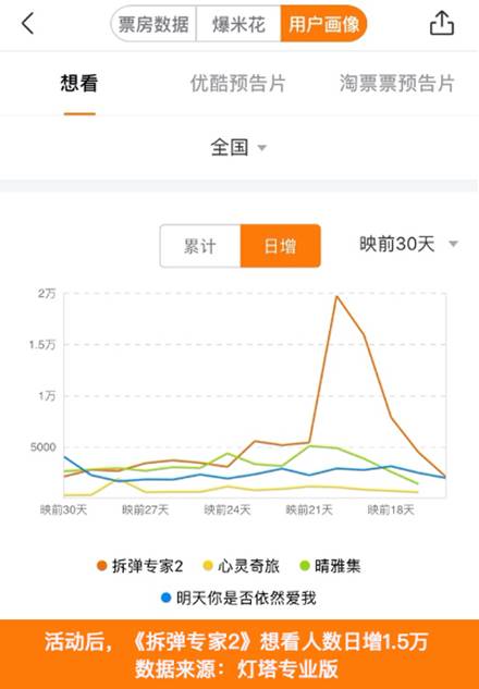 12月4日,《拆彈專家2》主創與薇婭進行了一場破圈式的“沖擊播”線上路演。本次線上路演不僅創下66萬張售票量的行業新紀錄,同時成為影片營銷的有效助力:社交媒體刷屏,相關話題連續五天登上微博熱搜。燈塔專業版數據顯示,12月5日,影片的單日想看人數陡增1.5萬,想看趨勢上升明顯。