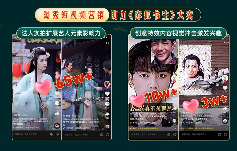 在《拆彈專家2》“沖擊播”卡爆薇婭直播間、創下66萬張的售票新紀錄之前,行業紀錄由《赤狐書生》的28萬張售票紀錄保持。此外,阿里影業新營銷矩陣的新銳奇兵淘秀光影,在短視頻領域以二次創作的形式為《赤狐書生》造勢,以達人實拍、創意特效內容助力影片破圈,觸達更多潛在用戶。