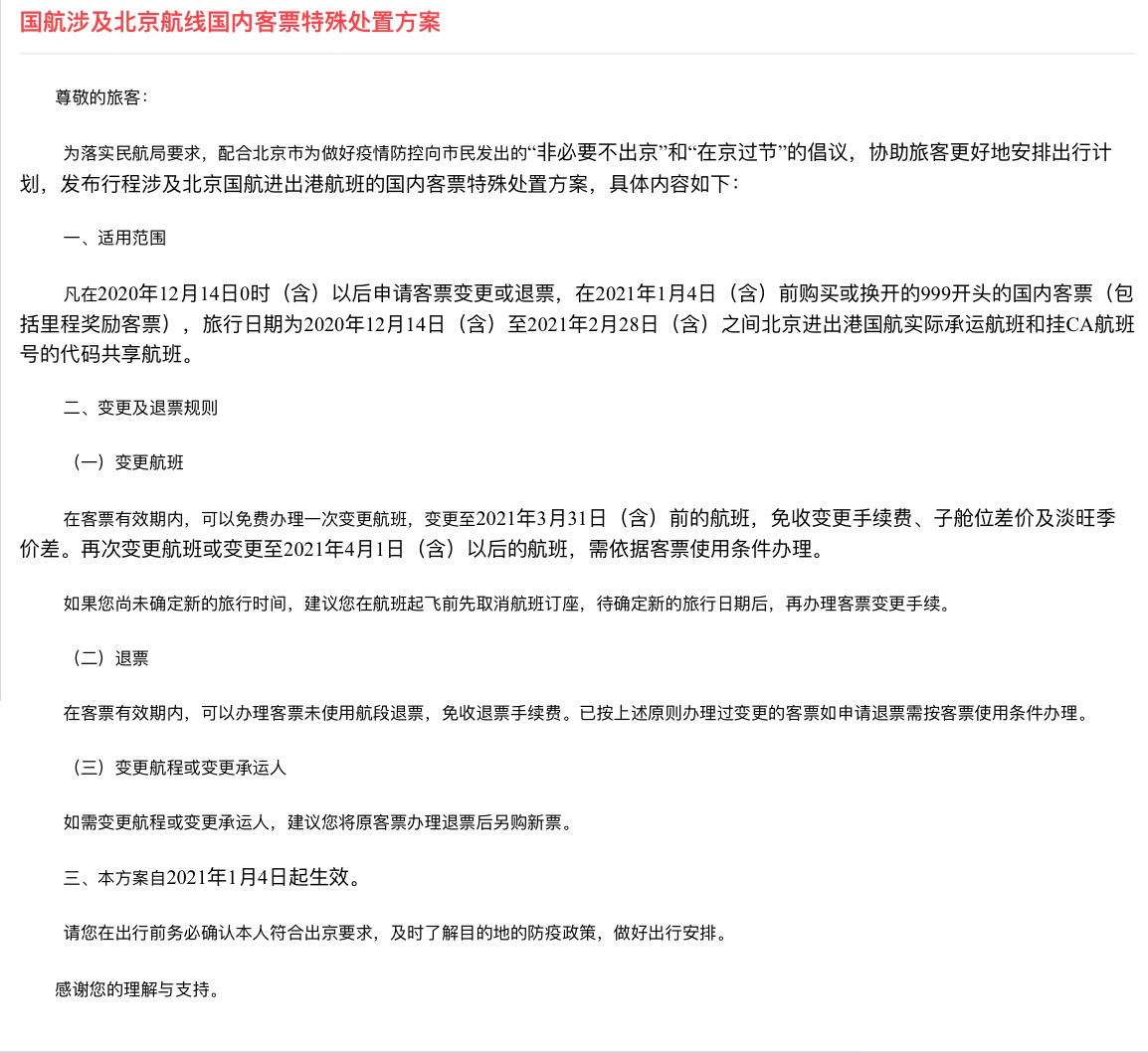 國航公告稱,凡在2020年12月14日0時(含)以后申請客票變更或退票,在2021年1月4日(含)前購買或換開的999開頭的國內客票(包括里程獎勵客票),旅行日期為2020年12月14日(含)至2021年2月28日(含)之間北京進出港國航實際承運航班和掛CA航班號的代碼共享航班,符合以上條件的旅客適用客票退改政策。