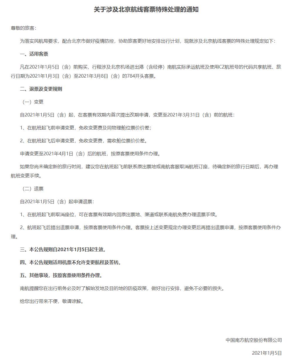 南方航空也發布公告稱,凡在2021年1月5日(含)前購買、行程涉及北京機場進出港(含經停)南航實際承運航班及使用CZ航班號的代碼共享航班、旅行日期為2021年1月3日(含)至2021年3月8日(含)的784開頭客票,符合以上條件的旅客適用客票退改政策。