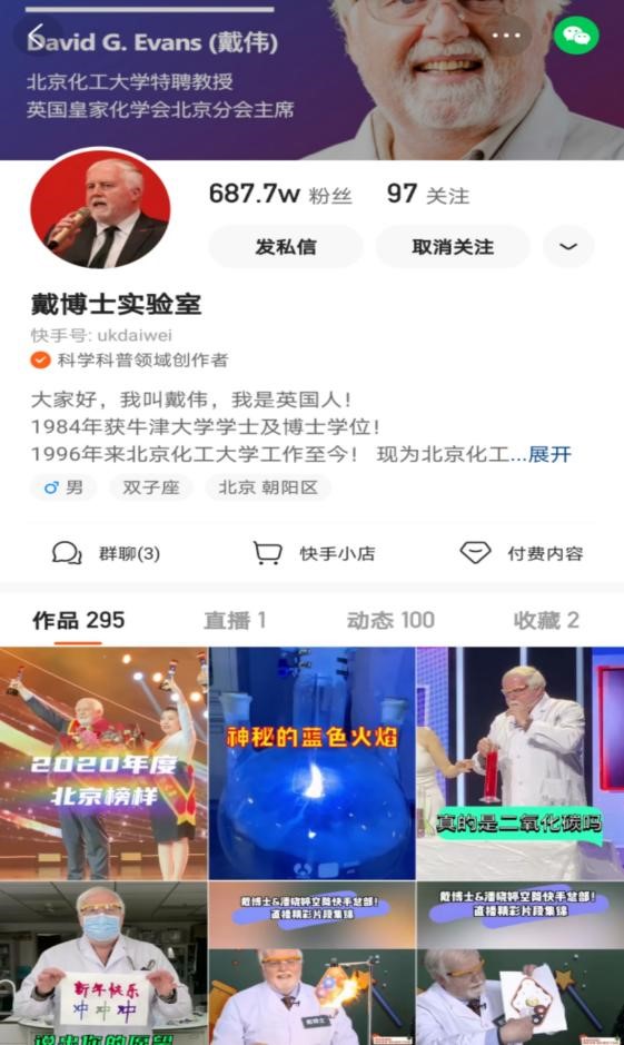 戴偉是北京化工大學特聘教授,也是快手上大家耳熟能詳的“戴博士實驗室”(ID:679097589)。