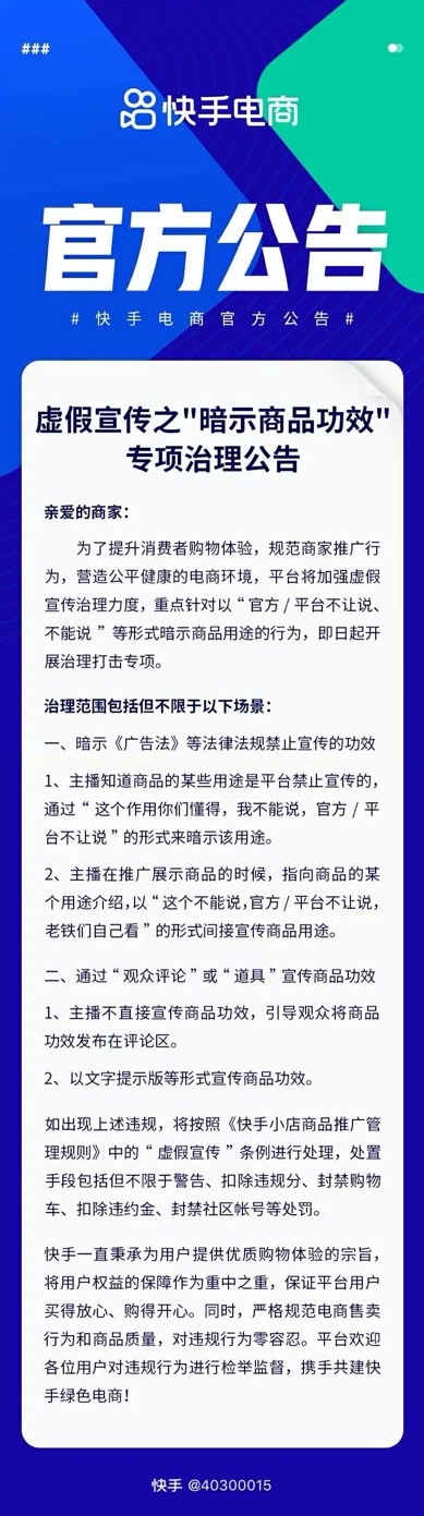 據公告顯示,快手平臺將加強虛假宣傳治理力度,重點針對暗示商品用途的行為開展專項打擊治理。
