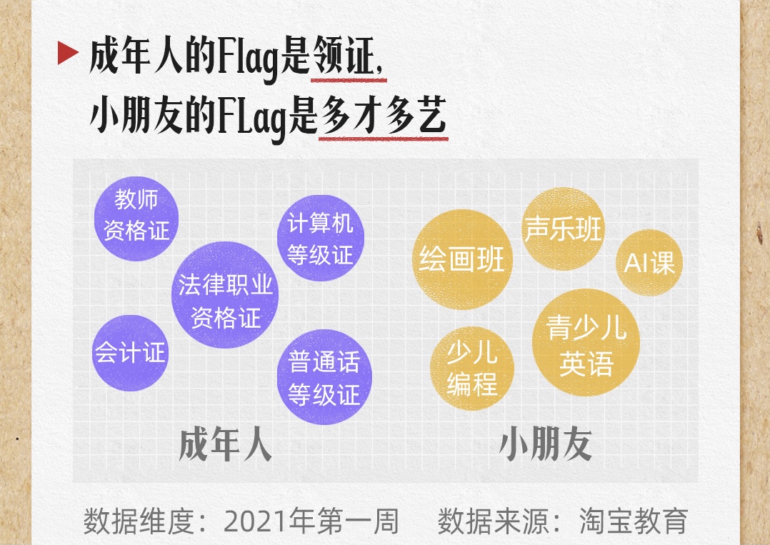 熱心的父母?jìng)儯粫?huì)只給自己立Flag,總得順手幫孩子規(guī)劃寒假小目標(biāo),繪畫、聲樂(lè)、少兒編程課最為緊俏。2021年第一周,兒童興趣課程的消費(fèi)增幅超過(guò)1300%、青少兒英語(yǔ)增長(zhǎng)近1000%,小學(xué)輔導(dǎo)課也翻了2倍,在寒假里喜提學(xué)習(xí)Flag的小朋友比去年多了不少。
