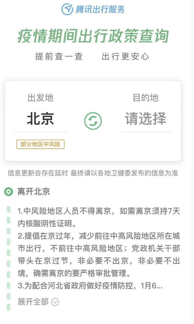 通過“微信-支付-出行服務”或微信搜一搜“出行服務”進入“騰訊出行服務”小程序,輸入出發地和目的地城市,即可查詢兩地疫情期間實時出行管控政策。