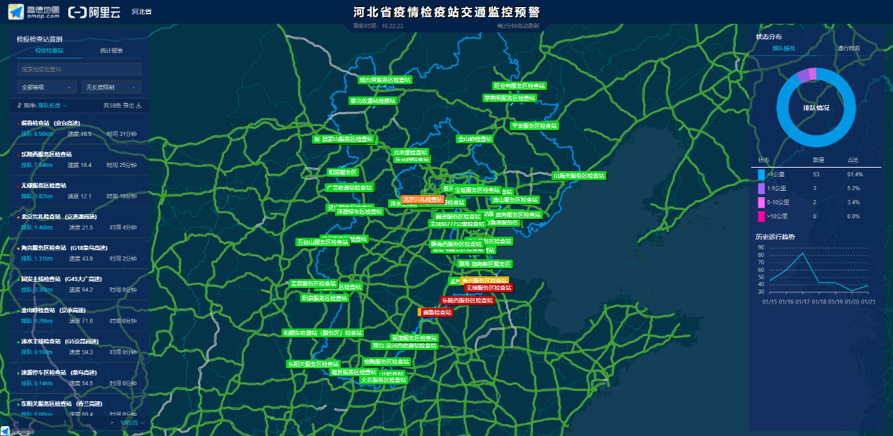 出于疫情防控需要,多地在入境通道設置檢疫站點,對來往車輛和人員進行檢疫檢查。高德地圖于不久前上線的“疫情檢疫站交通監控預警平臺”已覆蓋北京、石家莊、大連等多個城市的檢疫站點。基于該系統交管部門可實時查看檢疫站交通擁堵路況和車輛排隊情況,并進行小時級自動統計,當發生嚴重擁堵時,可進行后端分流決策,有效提升檢疫站點的交通調度水平。